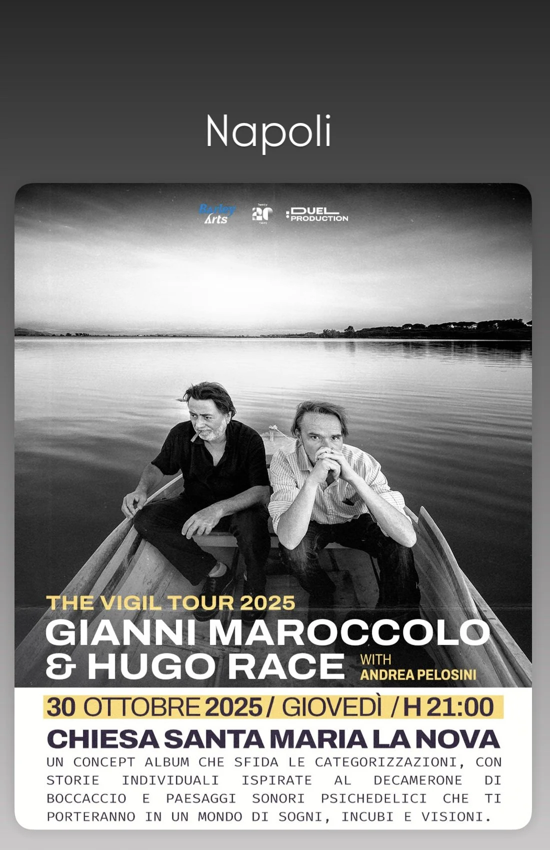 It's 2022. The world lockdown is finally over. Imagine a picturesque lake in Tuscany. Now imagine a floating state of the art studio on that lake with two maverick rock icons creating a wild, alchemical concept album: Hugo Race, frontman of Australian post-punk legends The Wreckery and guitarist for the Bad Seeds and leader of True Spirit and Fatalists, and Gianni 'Marok' Maroccolo, producer of Italian alternative music and film soundtracks since the 1980s Florence darkwave scene with Litfiba, CSI & CCCP. Together, they fuse an existential narrative made up of individual stories in the style of Boccaccio's Decameron with psychedelic soundscapes framed by experimental electronica, rock instrumentation and decades of experience as cutting edge musicians and studio producers to bring you an album that defies categorization - The Vigil…
